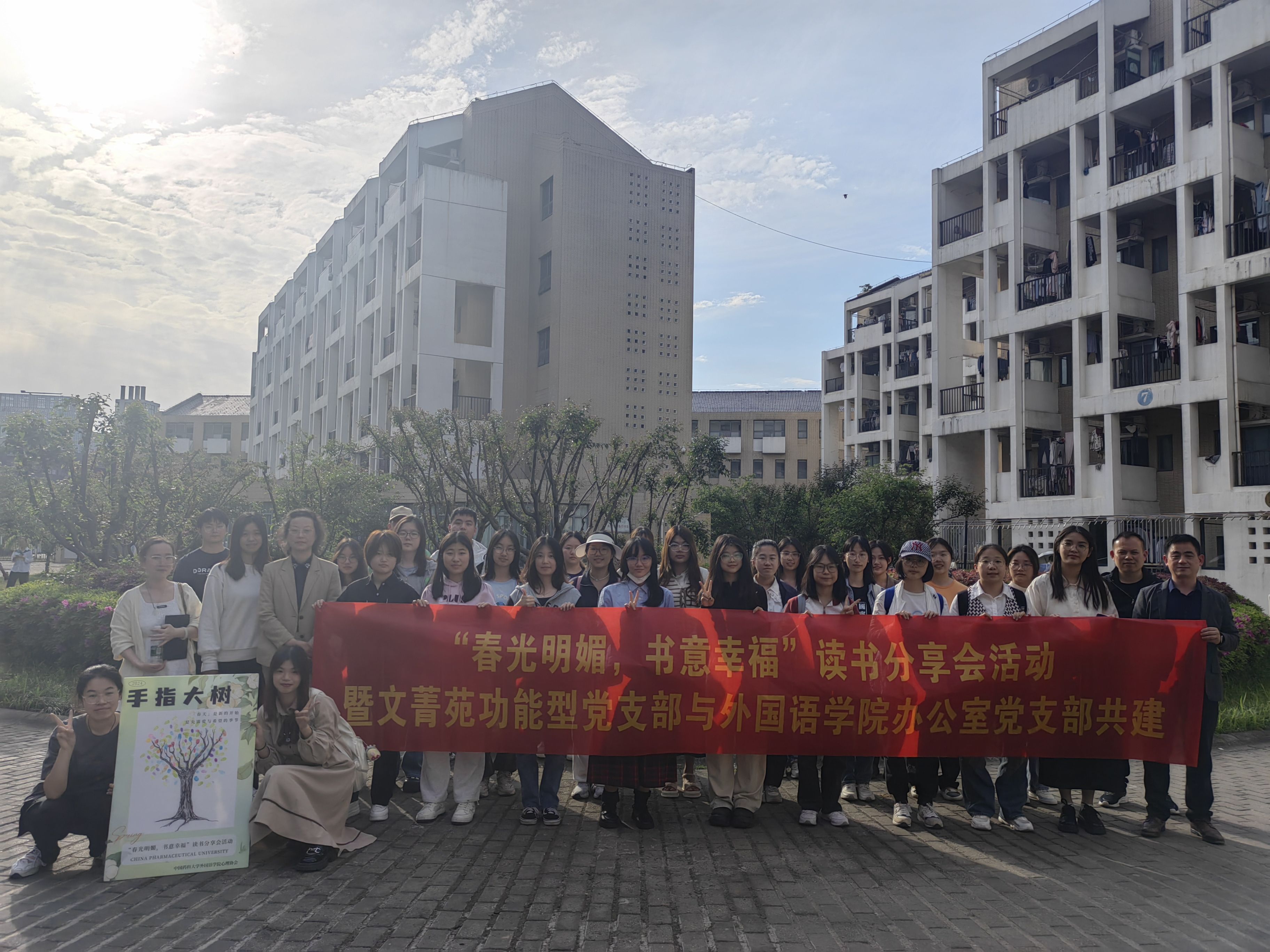 手捧一本好书,相约人间四月。为营造校园书香氛围,引导学生在书籍中汲取营养、悦纳自我,养成积极向上、乐观阳光的心态,4月24日下午,外国语学院于A8青年之家举办“春光明媚,书意幸福”读书分享会暨文菁苑功能型党支部与外国语学院办公室党支部共建活动。外国语学院党委副书记朱志龙、办公室党支部成员、文菁苑功能型党支部成员、文菁苑及外国语学院学生代表五十余人参与活动。
