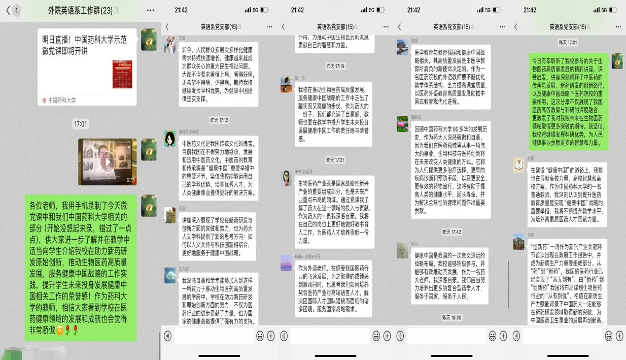 药学英语系、研究生英语教学部联合党支部书记陈菁表示,药学作为与人民群众生命健康息息相关的专业,其从业者必须具备高尚的职业道德和强烈的责任感。作为教师,应当在日常教学中融入职业素养教育,通过案例分析、专题讲座等形式,让学生深刻理解作为药学人的使命与担当,培养他们成为有爱心、有责任感的药学专业人才。