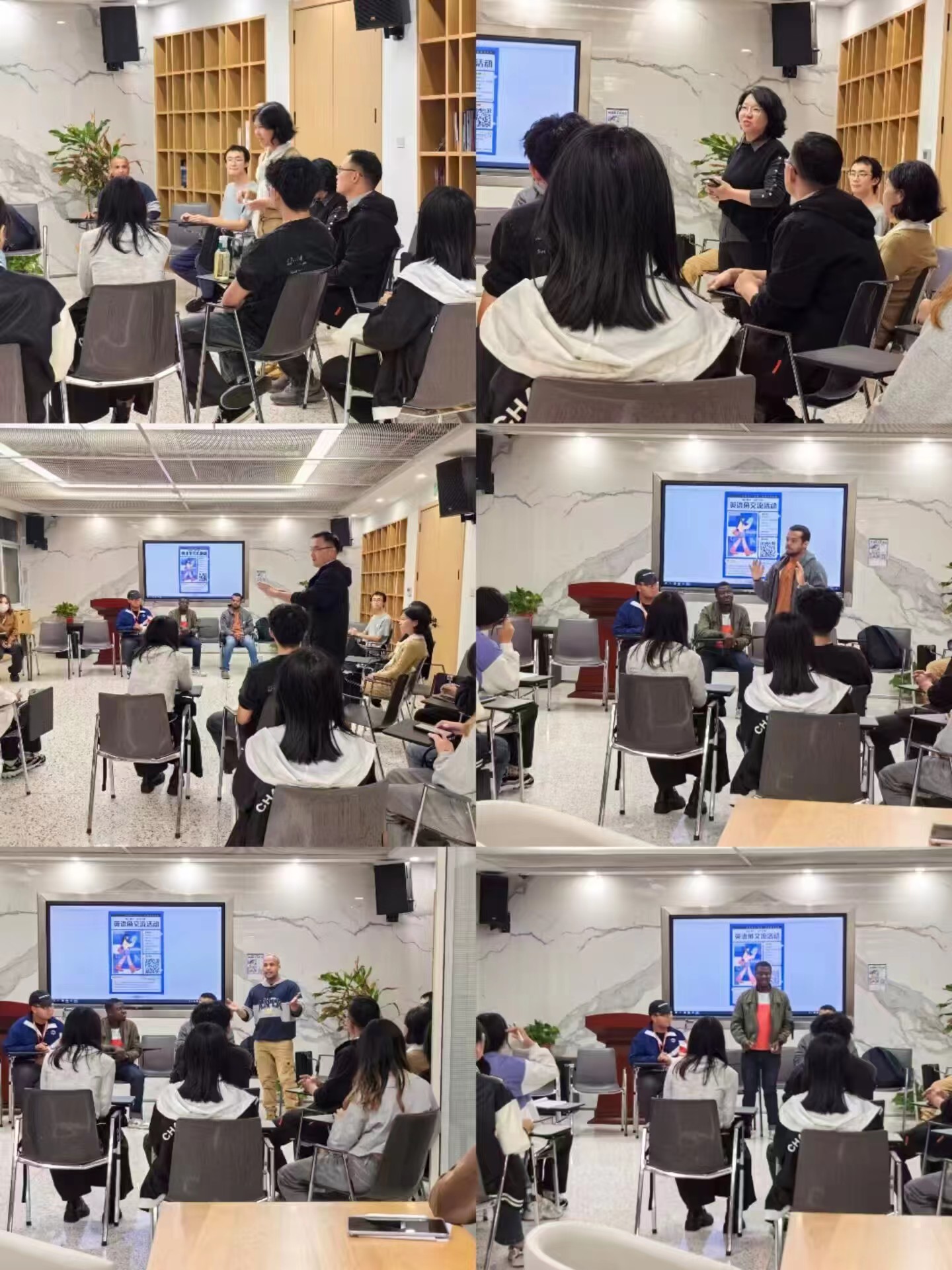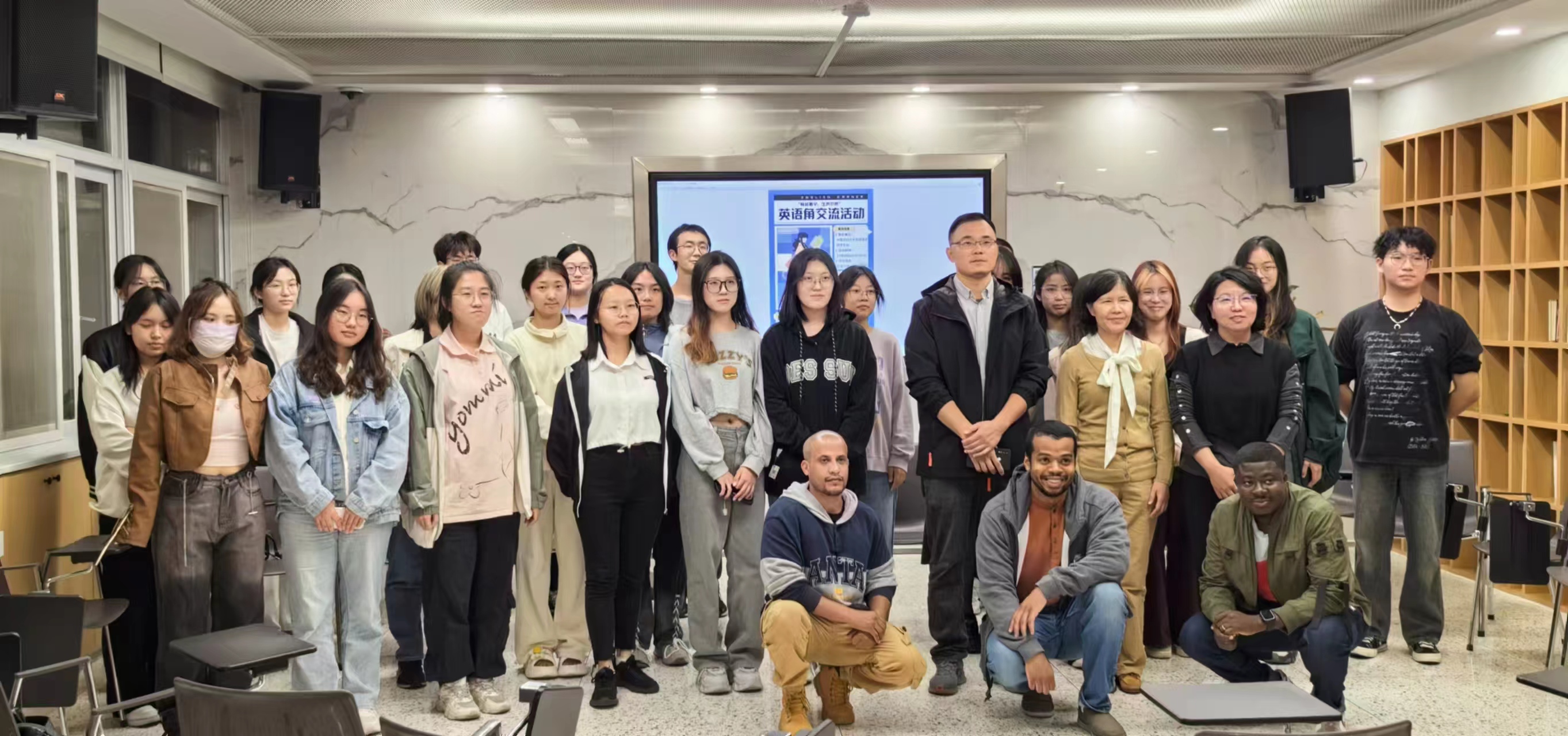 为帮助学生提升英语口语水平与国际交流能力,拓宽国际视野,10月11日晚,外国语学院在经管文楼英·悦空间精心举办了2024首期“畅叙寰宇”英语角活动。本次活动由外国语学院国际交流中心主任杨凯和辅导员黄旭东主持策划,外国语学院英语系主任陆萍、大学英语教学部主任殷丽、外教老师Calvin、Simon、Aseda作为活动嘉宾,与来自全校不同专业的三十余名学生共同参与。