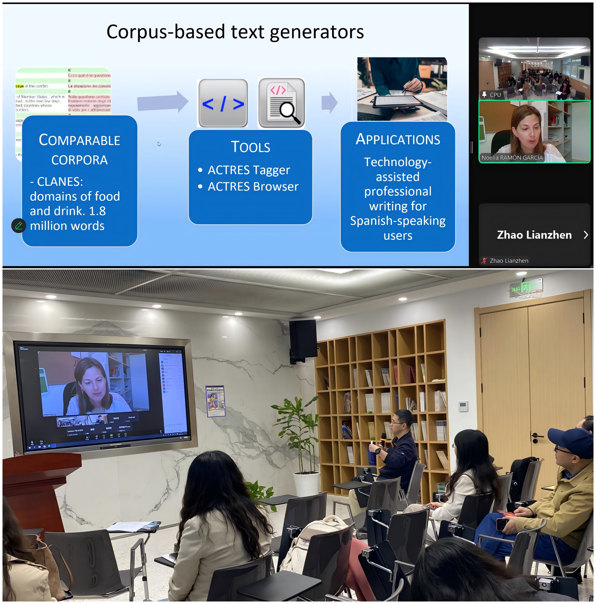 11月13日,外国语学院在经管文楼312英·悦空间举行了“2024年中国药科大学学术周”分会场国际学术讲座。西班牙莱昂大学现代语言学系Noelia Ramón教授应邀以“Academic Research and Knowledge Transfer in Foreign Language Studies”(外语学科学术研究与科研成果转化)为题作了在线专题讲座。讲座由外国语学院殷丽、赵连振两位老师主持,外国语学院全体专任教师参加。