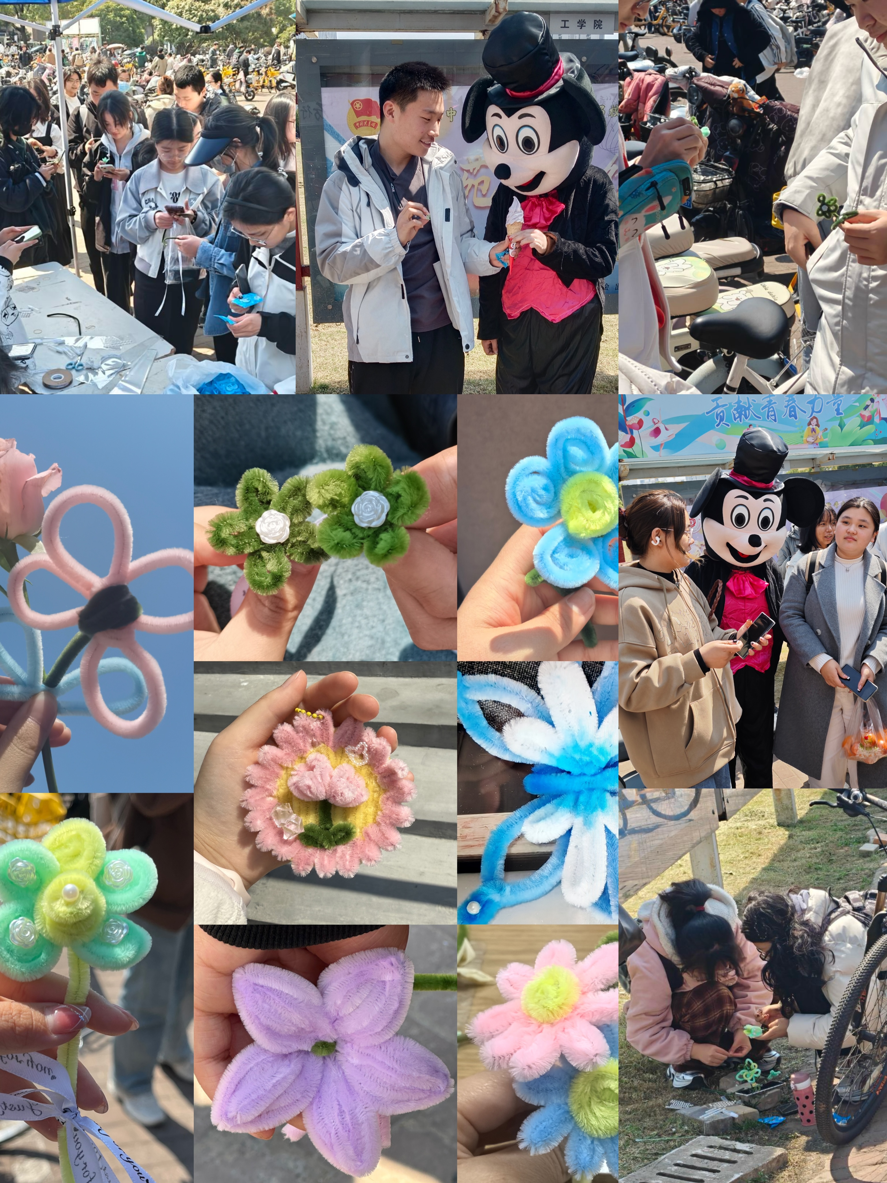 活动现场分为手工创作和暖心互动两大板块。在创意工坊区,同学们将彩色扭扭棒弯折成玫瑰、向日葵等形态各异的花朵,辅以丝带、贴纸进行个性化装饰,指尖的专注创作让日常压力悄然释放。“看着普通材料变身艺术品,就像把烦恼也编织成了美好。”英语专业王同学感叹道。互动区里,手持花朵的学生们与"米奇"玩偶热情拥抱,在欢声笑语中诠释“爱的传递”,更有同学将手作花束赠予师长或贴在“心灵寄语墙”上,让温暖在校园流动。