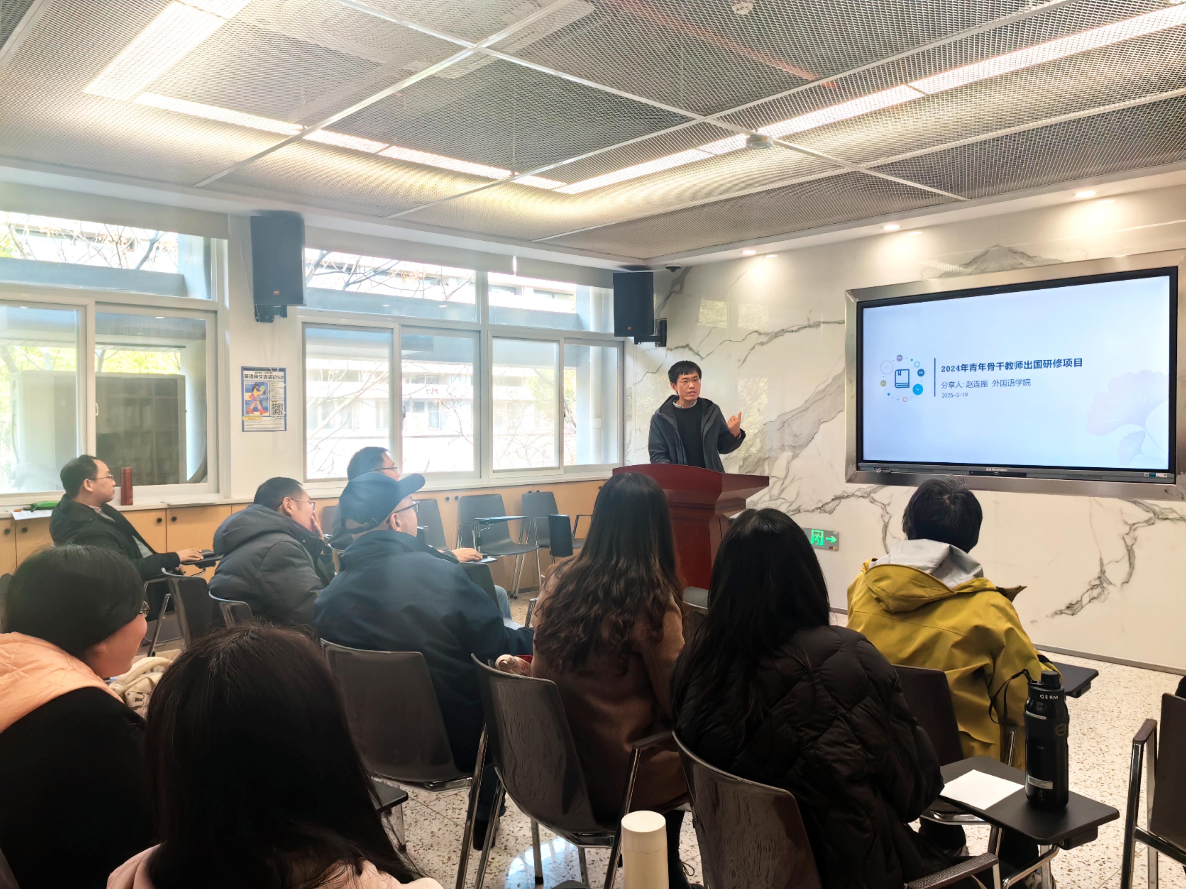 近期外国语学院在经管文楼英·悦空间组织举办2024年度高等学校青年骨干教师访问学者归国交流分享,刚从英国萨里大学(University of Surrey)访学归国的赵连振老师分享了在英国研修一年中的生活、工作、学习经历,大学英语教学部全体教师参加