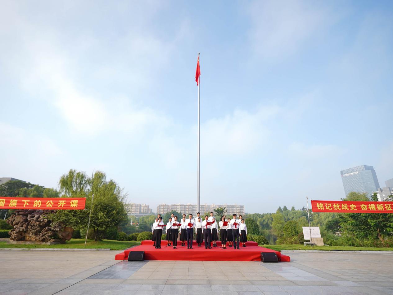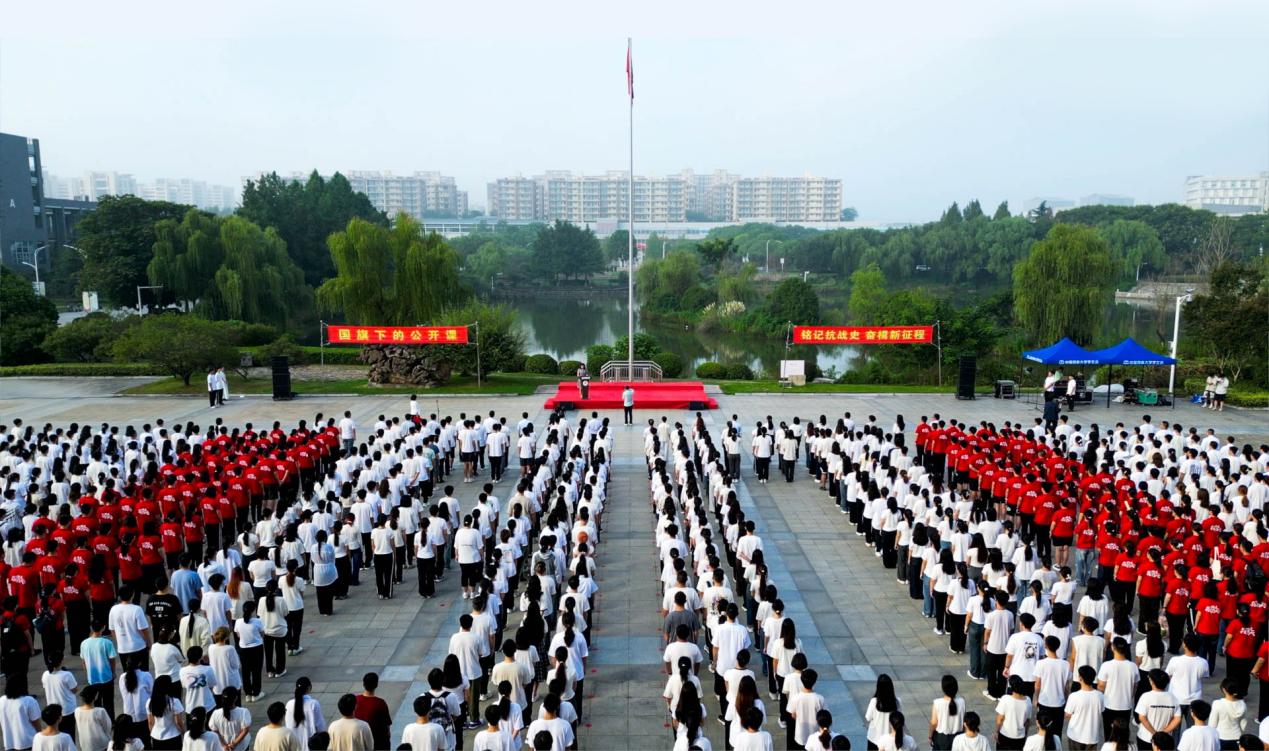 9月3日,由校团委主办、外国语学院承办的“铭记抗战史,奋楫新征程”纪念中国人民抗日战争暨世界反法西斯战争胜利80周年升国旗仪式暨“国旗下的公开课”第四十三次集体课程在江宁校区1936广场举行。校党委副书记朱红出席活动。相关职能部门负责同志,各学院相关领导、教师和辅导员代表,本科新生骨干训练营营员及学生代表共计1000余人参加活动。活动由外国语学院党委书记付蕾主持。