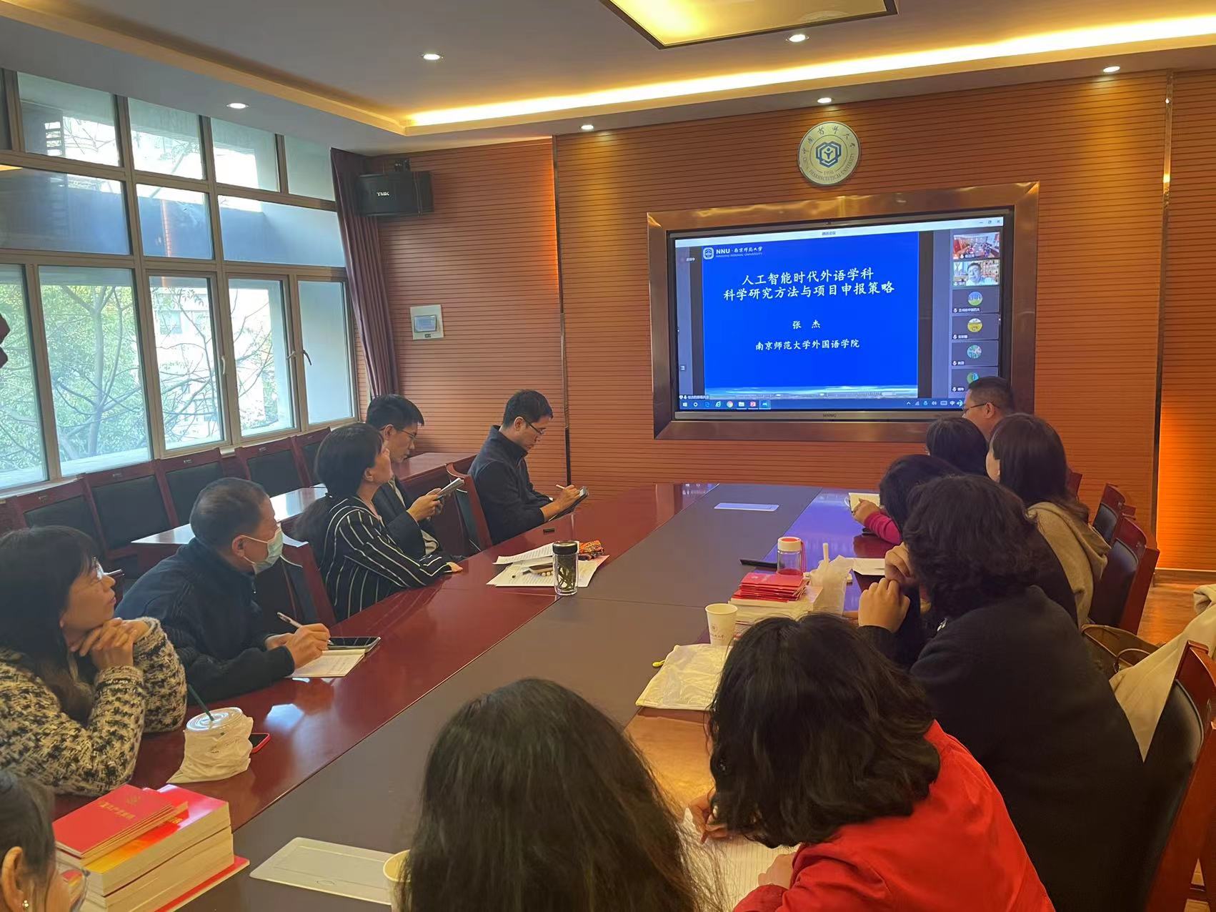 11月9日下午,中国药科大学学术周外国语学院分会场报告会在江宁校区经管文楼306会议室成功举办。本次报告会采用线上和线下相结合的方式,邀请了南京师范大学外国语学院博士生导师张杰教授,为学院中青年骨干教师做了题为《人工智能时代外语学科科学研究方法与项目申报策略》的报告。报告会由外国语学院院长赵光慧教授主持。