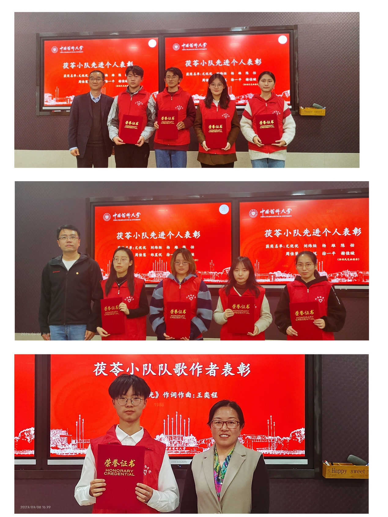 随后,杜文清处长、张杨彬书记为“茯苓小队”先进个人颁发荣誉证书。其后,由“茯苓小队”成员王奕程同学原创作词作曲的“茯苓小队”队歌《并肩寻光》隆重发布,悠扬悦耳的歌声在会场久久回荡,充分展现了茯苓小队“团结互助、奉献社会”的精神内核,进一步提升了“茯苓小队”的凝聚力和向心力。付蕾书记为王奕程同学颁发队歌采用证书。最后,“茯苓小队”成员分别前往植物园、食堂、1936广场等地开展植树、除草、排放自行车等美化校园志愿服务工作。
