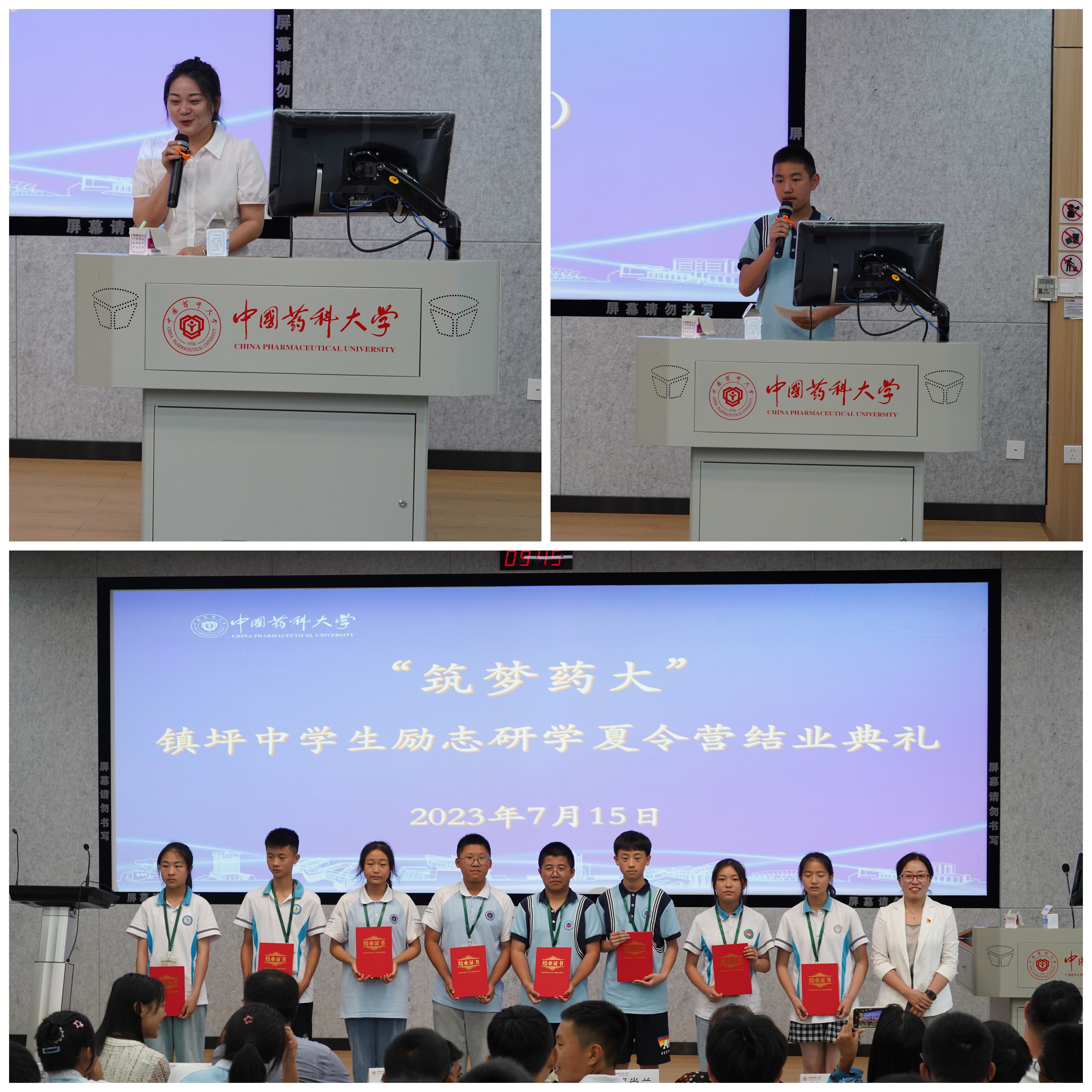 结业典礼上,付蕾书记为中学生代表颁发结业证书并致辞。付书记首先对学员顺利结业表示诚挚的祝贺,并结合药大校训校歌中的育人文化,从树立远大理想,矢志报效祖国;永葆仁爱之心,多做暖心之事;积极躬身实践,谱写奋斗华章三方面与中学生共勉。最后欢迎中学生们将来报考中国药科大学,为祖国医药事业发展和镇坪乡村振兴贡献青春力量。镇坪县牛头店九年制学校胡静老师作为中学生带队教师代表发言,感谢药大组织本次夏令营活动,充分肯定了中学生们在本次夏令营活动中的表现。镇坪县初级中学杜家宜作为学员代表发言分享了在本次夏令营中的收获和感想。